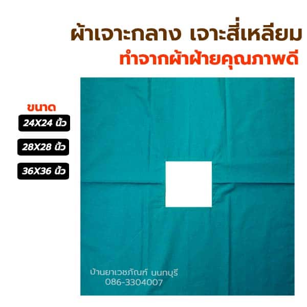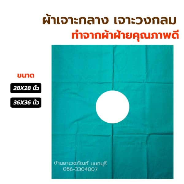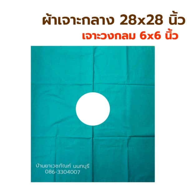 ผ้าเจาะกลาง หนา 2 ชั้น สีเขียวเข้ม ทำจากผ้าฝ้าย 100% นำกลับมาใช้ซ้ำได้ สามารถนำไปอบหรือนึ่งฆ่าเชื้อได้ ใช้ในห้องผ่าตัด หรือสวนปัสสาวะ