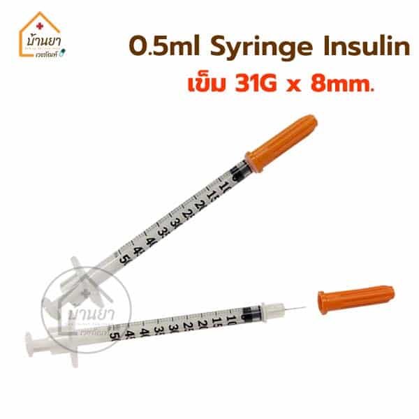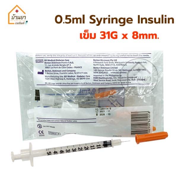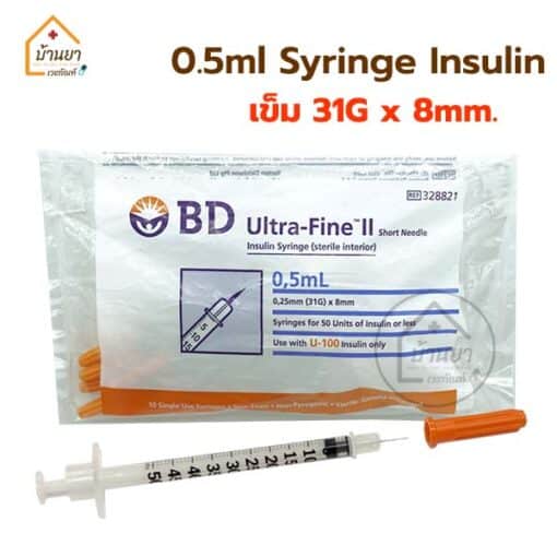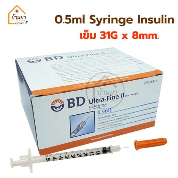 Syringe Insulin With Needle ไซริงค์ กระบอกฉีดอินซิลิน ขนาด 0.5 ml มีเข็มติดกับ Syringe เบอร์ 31G X 8mm. ใช้กับ U-100 Insulin ยี่ห้อ BD Ultra-Fine II